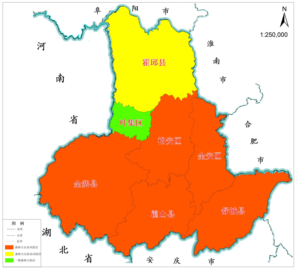 第一章 森林防火现状第一节 基本概况自然条件。六安市位于安徽省西部,俗称“皖西”。是大别山区域中心城市、省会合肥经济圈副中心城市、皖江城市带接点城市、长三角产业转移辐射城市、国家级陆路交通枢纽城市。辖区东邻省城合肥市,南接安庆市和湖北省英山、罗田、麻城,西与河南省商城、固始毗连,北接淮南市并与阜阳市隔河相望。地跨东经115°20′~117°14′,北纬31°1′~32°40′。东起舒城县杭埠镇太平村,西至金寨县沙河乡余家湾,宽176公里;南自霍山县太平畈乡挂龙尖,北至霍邱县周集镇朱港,长约179公里。全市总面积15451.2平方公里。市辖金安、裕安、叶集3个区,霍邱、金寨、霍山、舒城4个县,以及国家级六安经济技术开发区和六安市承接产业转移集中示范区;全市设有130个乡镇,10个街道,144个城市社区,1811个行政村。