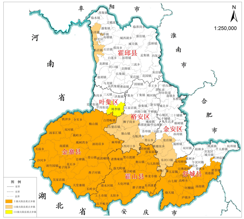 森林防火等级。六安市所辖4县、3区7个单位均为国家批准的全国重点森林火险县级单位,依据《六安市人民政府办公室关于印发六安市森林火灾应急预案的通知》(六政办秘〔2021〕110号),其中金寨县、霍山县、舒城县为I级火险县,金安区、裕安区和霍邱县为Ⅱ级火险县,叶集区为Ⅲ级火险县,并在各县区上报的基础上确定全市64个重点森林防火乡镇。