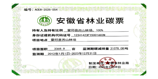 据悉,霍邱县西山林场现经营总面积计2.9万亩,林场活立木总蓄积9.1万立方米,森林覆盖率高,森林资源丰富,生态环境良好。此次首发的涉及霍邱县西山林场林业碳票监测期为2012年1月1日至2023年12月31日,林地3369.9亩,监测期碳减排量达31078.08吨。